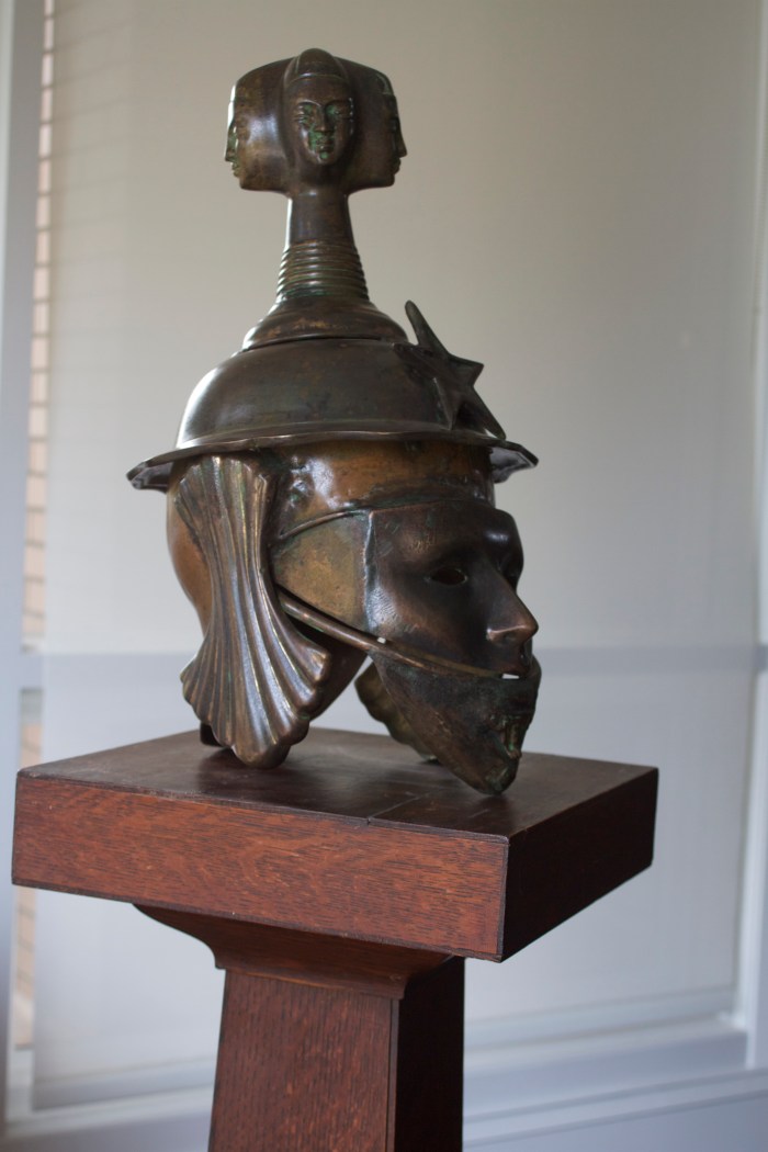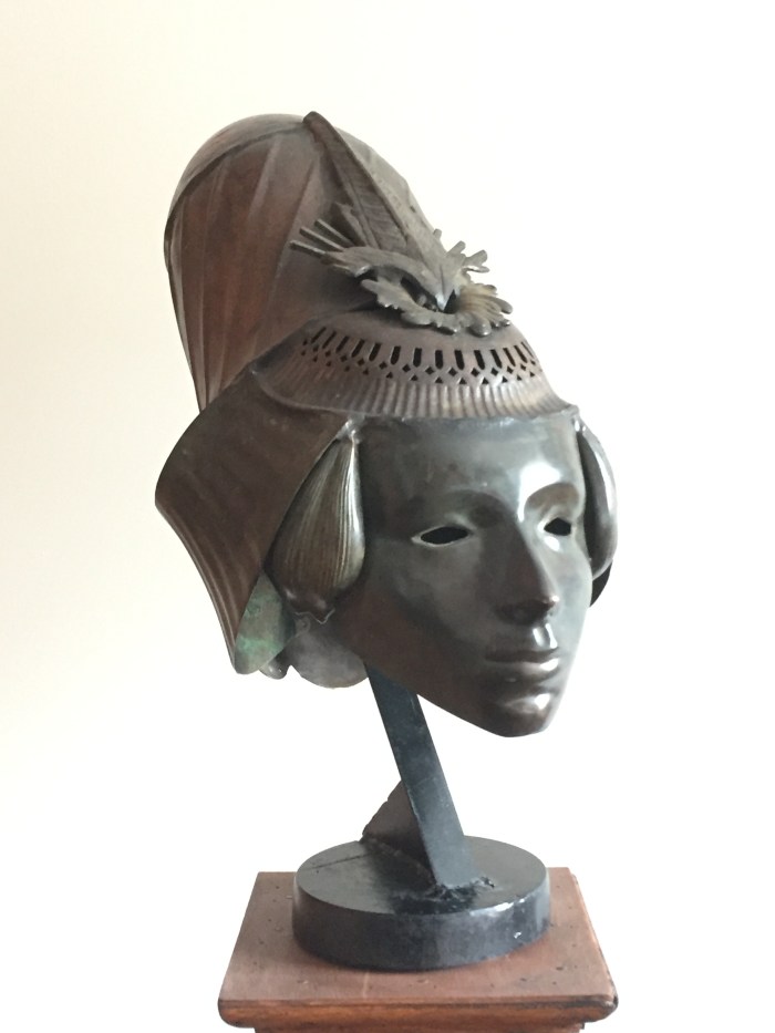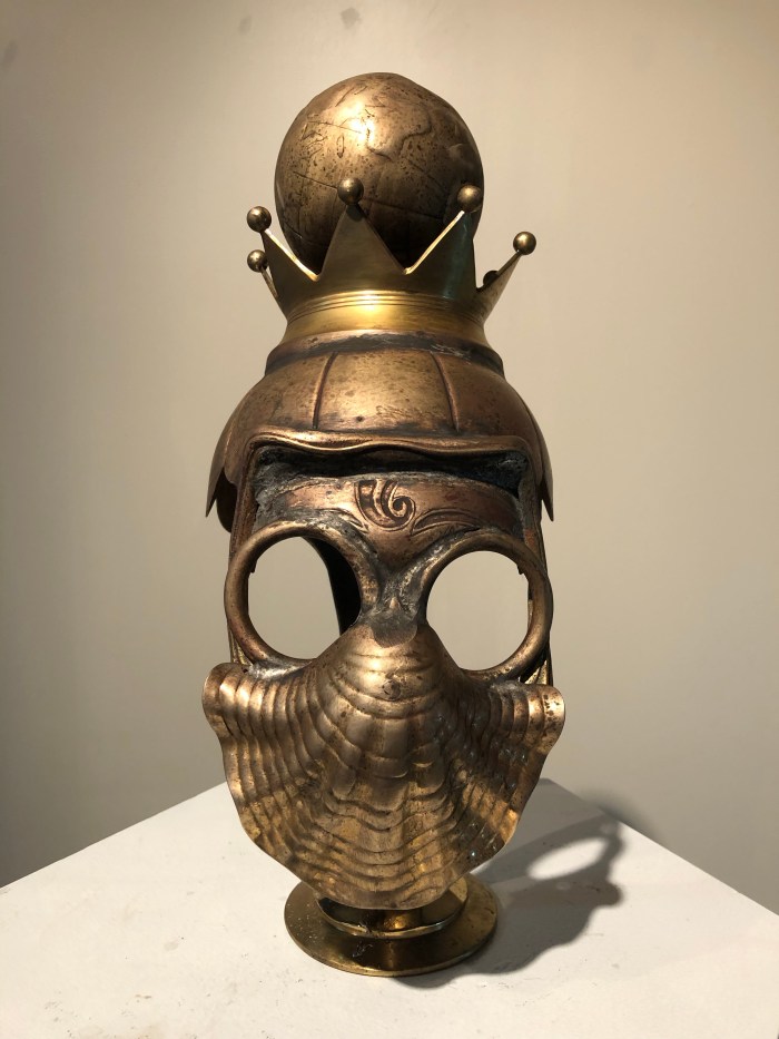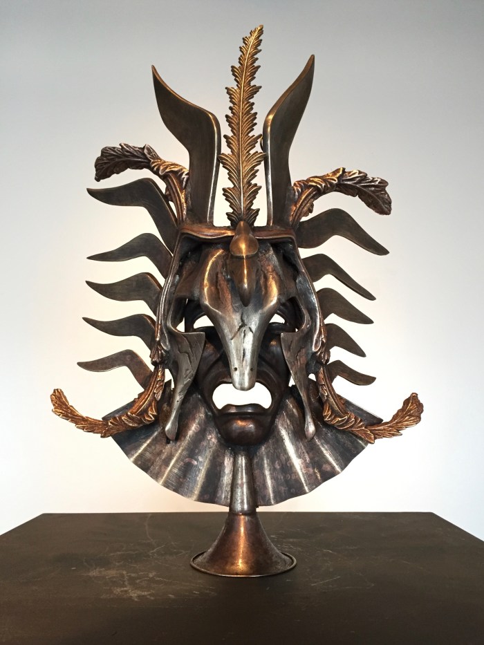 Soldered brass, 22 x 19 x 12, 2017. "Helm of the African King," a 2017 sculpture by Canadian artist Ryan McCourt, is a compelling soldered brass piece that evokes themes of leadership, heritage, and cultural identity. This wearable helmet is richly adorned with symbolic elements that create a narrative of regality and the natural world. … Continue reading The Helm of the African King