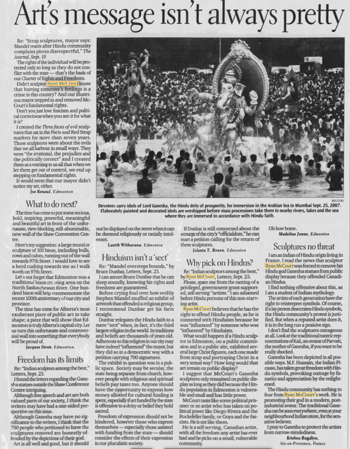 CanWest News Service, “Sculptures Offend Hindus”, Vancouver Sun, September 21.