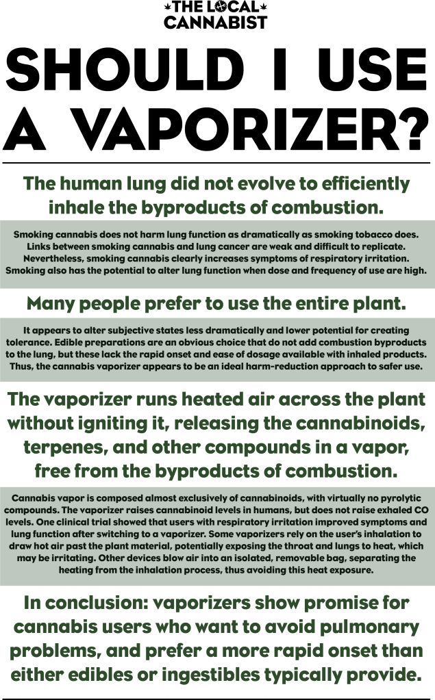 “Should I Use A Vaporizer” presents my paraphrasing of the summary of “No smoke, no fire: What the initial literature suggests regarding vapourized cannabis and respiratory risk“ an article by Mallory Loflin, MA and Mitch Earleywine, PhD, published in the Canadian Journal of Respiratory Therapy.